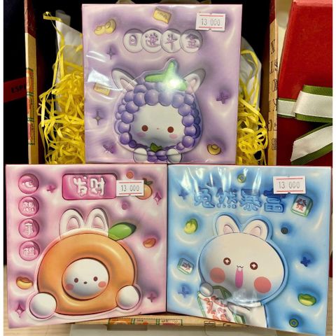 Bao bì hộp hình vuông, thiết kế dễ thương với hình thỏ đội nón trái cây (nho, đào, cam...) trên nền pastel tím, cam, xanh da trời.
