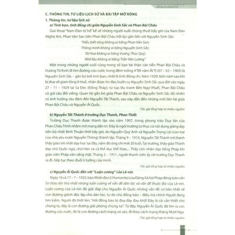 C. Thông tin, tư liệu lịch sử và bài tập mở rộng: cung cấp thêm những thông tin, tư liệu về các sự kiện, câu chuyện, nhân vật lịch sử và các bài tập mở rộng, nâng cao giúp em tích luỹ kiến thức, phát triển năng lực chuyên môn và kĩ năng vận dụng kiến thức vào thực tế cuộc sống.