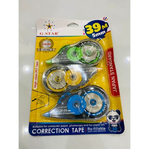 - Xóa kéo vỉ 3 cây GStar CR-08 khổ 5mm dài 39m với thiết kế thông minh với đầu xóa nằm ngang giúp lực kéo êm, nhẹ nhàng, dễ dàng sử dụng.